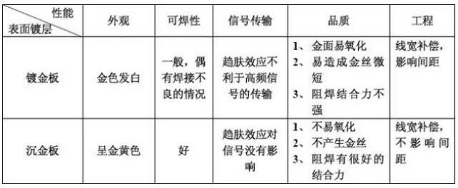 3、化學(xué)鎳金板(沉金)與電鍍鎳金板(鍍金)的機理區(qū)別參閱下表: